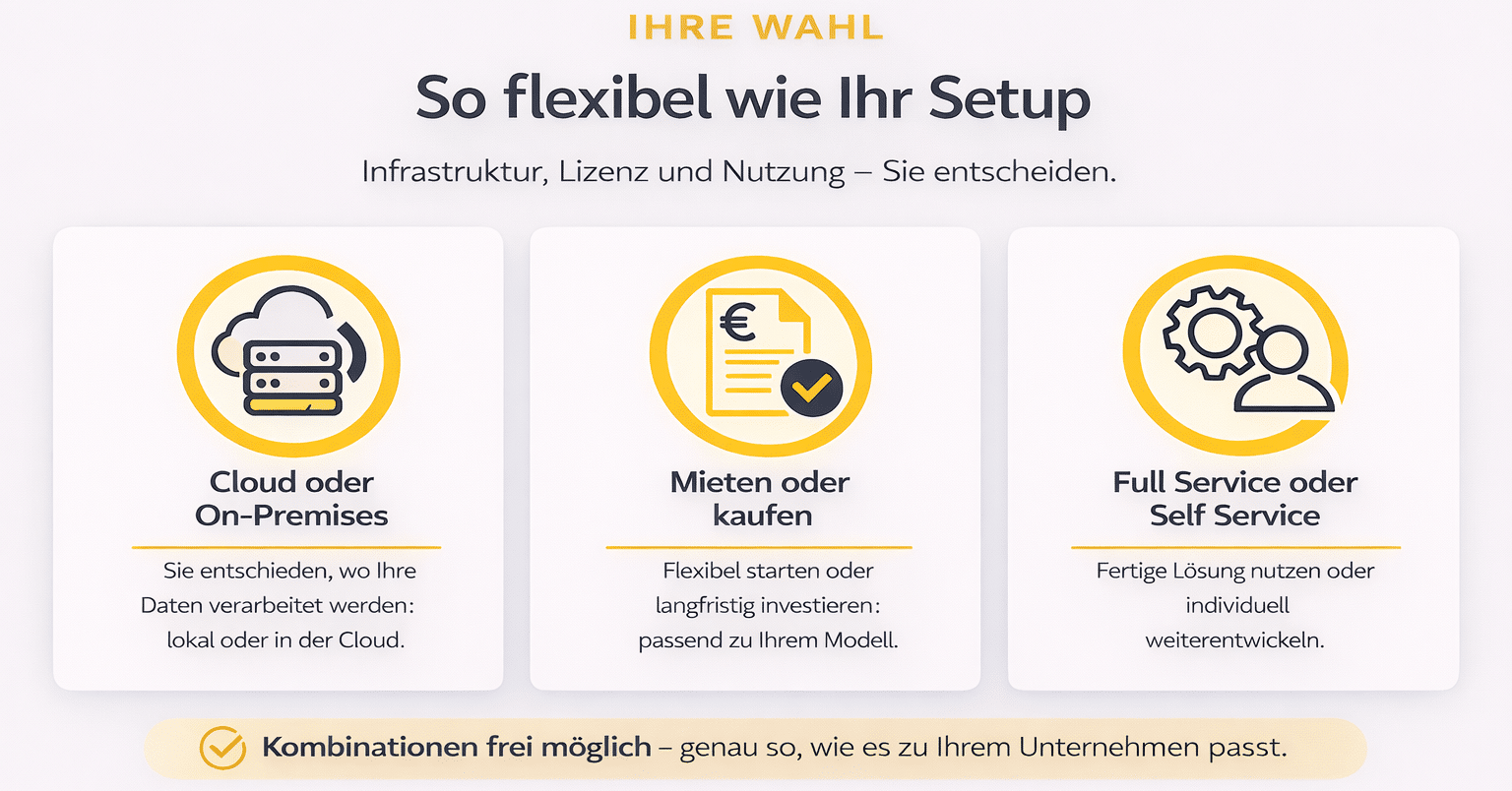 - Unterstützt DATEV Rechenzentrum, DATEVasp / SmartIT und On-Premise Installationen.